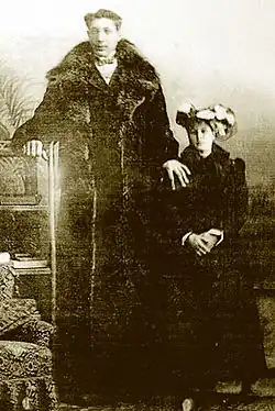 As a young man in his twenties he toured Europe to exhibit his great height. After having spent time in Berlin he visited London in 1905 where he joined the Hippodrome accompanied by his wife and young child. He then toured the United States in 1906 where he met President Roosevelt as well as actor and fellow giant George Auger.[nb 1] Throughout his tour his promoters exaggerated his height, and he was usually accredited with a considerably inflated stature as high as 9 feet 3 inches (282 cm) and billed as "The Russian Giant."[1] On the obelisk it is still possible to read: «Фёдор Андреевич Махнов. Родился 6 июня 1878 года. Умер 28 августа 1912 года. Самый высокий человек в мире. Ростом был 3 аршина 9 вершков» ("Fyodor Andreevich Makhnov. Born 6 June 1878. Died 28 August 1912. The tallest man in the world. His height was 3 arshins 9 vershoks [254 centimetres] tall"). Makhnov's wife, Efrosinya wanted to correct the incorrect figure on the monument, but could not do so because of the beginning of the First World War and then the Revolution of 1917.[5]