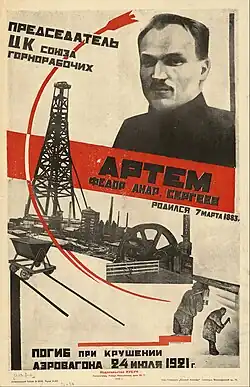 Fyodor Andreyevich Sergeyev[a] (Russian: Фёдор Андреевич Сергеeв; Ukrainian: Федір Андрійович Сергєєв, romanized: Fedir Andriiovych Serhieiev; March 19, 1883 — July 24, 1921), better known as Comrade Artyom (Russian: товарищ Артём), was a Russian Bolshevik revolutionary, Soviet politician, agitator, and journalist. He was a close friend of Sergei Kirov and Joseph Stalin. Sergeyev was an ideologist of the Donetsk–Krivoy Rog Soviet Republic.