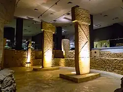 Recent findings suggest a settlement at Göbekli Tepe, with domestic structures, extensive cereal processing, a water supply, and tools associated with daily life.[7] This contrasts with a previous interpretation of the site as a sanctuary used by nomads, with few or no permanent inhabitants.[1] No definitive purpose has been determined for the megalithic structures, which have been popularly described as the "world's first temple[s]".[8] They were likely roofed and appear to have regularly collapsed, been inundated by landslides, and subsequently repaired or rebuilt.[9][10] The architecture and iconography are similar to other contemporary sites in the vicinity, such as Karahan Tepe.[11]