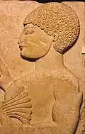 According to Figen Çevirici-Coşkun in Anatolian Studies, the relief probably depicts an African male figure presenting gifts to the tomb owner, the latter perhaps being a Persian noble or a non-Persian noble serving the Persians, who had adopted Persian cultural habits.[5] The African figure was either a servant or friend of the tomb owner.[5] Çevirici-Coşkun notes that this does not come as a surprise, as the Achaemenid Empire was multi-ethnic and the Persians lived together with other nations.[5] Furthermore, archaeological data from Sardis (the capital of the Lydian satrapy) and Dascylium (the capital of the Hellespontine Phrygia satrapy) has shown the existence of cosmopolitan populations in these important satrapy centres.[5] According to Elspeth R. M. Dusinberre, the figure remains ambiguous, and could also be a woman, although women are not generally depicted in Persian relief sculptures.[6]