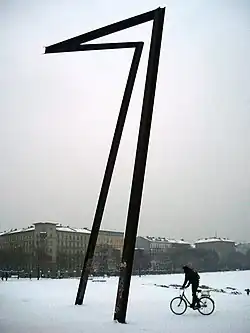 The Görlitzer Tunnel was still walkable until at least the end of 1989, the removal of which gave the park a large hollow in the middle, which forms a kind of natural arena. The former walls of the tunnel were included as a design element and are still recognizable today. On the west side of the basin is a 14-metre (46 ft) steel-beam sculpture, Schreitender Mensch, by Rüdiger Preisler.