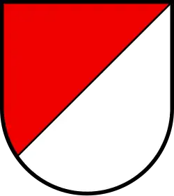 The blazon of the municipal coat of arms is Per bend sinister Gules and Argent.[5]