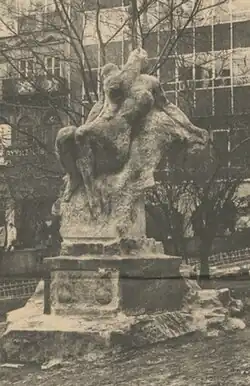 On the night of 18 March 1974, nine days after its installation, Güzel İstanbul was removed from Yıldız Park.[26] In a midnight "sledgehammer operation", the sculpture was broken off its plinth and damaged: its arm was broken off and its plinth motifs destroyed.[12][27] It was removed from the park and placed on a pile of sand near the Kumkapı municipal construction aggregate site.[26][28] The front page of the newspaper Milliyet showed a photograph of people posing on top of the empty plinth on the night the sculpture was removed, as well as the rubble resulting from the plinth's destruction.[29] An article in the newspaper Sabah stated the goal of their campaign to have the sculpture removed had been accomplished and that the paper was the voice of the people concerning the matter.[26] This was countered by articles in the newspapers Milliyet and Cumhuriyet, which described the sculpture's right to remain as a necessity for democracy.[30]