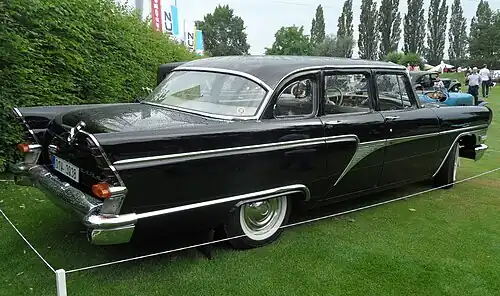 The GAZ-13 Chaika[1] debuted in 1958 and was exhibited internationally at the Brussels motor show.[2] It was produced from 1959 to 1981, with a total of 3,179 built.[3] The GAZ-13 was powered by a 195-hp SAE gross 5.5 L V8 and driven through a push-button automatic transmission of a similar design to the Chrysler TorqueFlite unit. It was offered as a saloon (GAZ-13), limousine (GAZ-13A), and four-door cabriolet (GAZ-13B) with an electrohydraulic top.[3] The cabriolet was made in 1961 and 1962 for official parades.[3] A station wagon version was also offered as a hearse or ambulance.