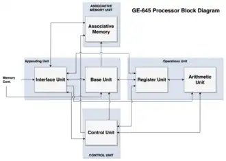 The GE 645 mainframe computer was a development of the GE 635 for use in the Multics project. This was the first computer that implemented a configurable hardware protected memory system. It was designed to satisfy the requirements of Project MAC to develop a platform that would host their proposed next generation time-sharing operating system (Multics) and to meet the requirements of a theorized computer utility.[1] The system was the first truly symmetric multiprocessing machine to use virtual memory, it was also among the first machines to implement what is now known as a translation lookaside buffer,[2][3][4] the foundational patent for which was granted to John Couleur and Edward Glaser.[5]