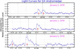 ![]() Ultraviolet band light curves for GX Andromedae, with flares marked by red arrows. Adapted from Pettersen and Griffin (1980)[1] | |
