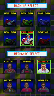 There is an Exhibition mode that can support two players and the Season mode. It is possible to choose between six bikes, and six different engineers whose skills match the player's racing style. While there are a variety of bikes with slightly different engines, suspensions and frames, there is no real difference between the engineers, but they will still influence the improvement or deterioration of the bike performance.