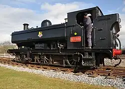 The early 0-6-0 tank engines were fitted with either saddle tanks (wrapped over the boiler) or side tanks (mounted at the side of the boiler and reaching down to the running platform). The Great Western first fitted pannier tanks (mounted on the side of the boiler but not reaching down to the running platform) in 1898 to a single 4-4-0T locomotive, No. 1490,[8] and, in 1901, to two 0-6-4 crane tank locomotives. They started to be fitted to 0-6-0 tanks from 1903, but weren't being fitted more generally until about the end of 1909.[9] The shape of the Belpaire firebox gives a larger surface area which improves heat transfer and steam production,[10] but their rectangular shape made them difficult to combine with saddle tanks.[11] Locomotives fitted with pannier tanks have a lower centre of gravity than those with saddle tanks (enabling higher speeds on curves),[11] and access for maintenance is easier than for those fitted with side tanks.[12]