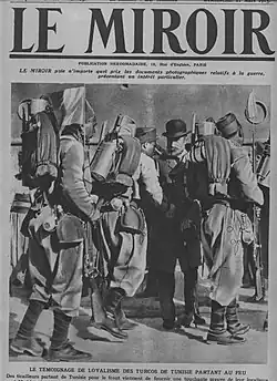 During World War I (1914–18) in December 1914 Alapetite wrote that German and Ottoman propaganda was convincing the tirailleurs that "the Commander of Believers forbids them to go and get themselves killed for the infidels."[17] Alapetite was opposed to letting indigenous soldiers return home, either as convalescents or on leave. Sending wounded men home would demoralize their families, and men on leave would exaggerate the dangers and hardships of total warfare in the cold climate of northern France. He did not feel that Tunisians should be treated in the same way as French people, since the Tunisian Muslims had a different mentality. He wrote, "it is dangerous to make of this affair a question of principle or sentiment."[18] Alapetite sent Muslim notaries to assist Tunisian soldiers and help with burial rites, but found it very difficult to find an imam to minister to the soldiers at the front.[19]