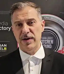 He played the carabiniere Michele Falcetti in the first three seasons of the television series Il maresciallo Rocca, an opportunity that was given to him after the show Il giallo è servito, which he wrote and directed. He graduated from Susan Strasberg's Actor Studio.[4] In 1996 he graduated in political science[5] at La Sapienza University in Rome with a grade of 108/110.[6] At the same time he began his radio adventure as a member of the Trio Medusa. The three have been hosting Radio Deejay Chiamate Roma Triuno Triuno since 2002.[7] From 2012 to 2020 he kept a blog for Il Fatto Quotidiano.[8]