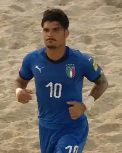 Gori recovered from knee surgery in time to be included in the Italian team for the 2011 FIFA Beach Soccer World Cup on home sand in Ravenna,[3] but suffered at the tournament with a fever.[6] At his next World Cup appearance in 2015, he scored his 100th goal for Italy during the semi-final defeat to Tahiti,[7] ending the tournament as its joint second top scorer.[8] Later that summer, he scored four of Italy's five goals in the gold medal match of the Mediterranean Beach Games versus Egypt,[3][9] securing Italy's first major honour for ten years.[10] After earning his 100th cap for Italy in September 2016,[11] Gori was then voted as one of the three best players in the world at that year's annual season-ending Beach Soccer Stars awards ceremony[12] and also won the Pallone Azzurro (Blue Ball) award for best Italian player of the year bestowed by the Italian Football Federation.[13] His biggest individual accolade came six months later at the 2017 World Cup, where he won the Golden Boot (top scorer) with 17 goals,[14] and his 12 goals during the 2018 EBSL season helped Italy secure their first European crown in 13 years, the biggest title of Gori's career.[10]