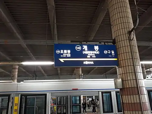 Gaebong Station (Korean: 개봉역; Hanja: 開峰驛; RR: Gaebong-yeok) belongs to Seoul Subway Line 1.