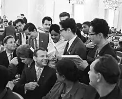 Gagarin gained a reputation as an adept public figure and was noted for his charismatic smile.[59][60][61] On 15 April 1961, accompanied by officials from the Soviet Academy of Sciences, he answered questions at a press conference in Moscow reportedly attended by 1,000 reporters.[62] Gagarin visited the United Kingdom three months after the Vostok 1 mission, going to London and Manchester.[59][63] While in Manchester, despite heavy rain, he refused an umbrella, insisted that the roof of the convertible car he was riding in remain open, and stood so the cheering crowds could see him.[59][64] Gagarin toured widely abroad, accepting the invitation of about 30 countries in the years following his flight.[65] In just the first four months, he also went to Poland, Brazil, Bulgaria, Canada, Cuba, Czechoslovakia, Finland, Hungary, and Iceland.[66] Because of his popularity, US president John F. Kennedy barred Gagarin from visiting the United States.[46]