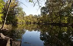 Gahanna was founded along the Big Walnut Creek in 1849 by John Clark of Ross County from 800 acres (320 ha) of land that his father, Joseph Clark, had purchased from Governor Worthington in 1814.[6] Clark named his property the Gahanna Plantation, from which the City of Gahanna derives its name.[7] The name Gahanna is derived from a Native American word for three creeks joining into one and is the former name of the Big Walnut Creek.[8] The City of Gahanna's Official Seal refers to this confluence of three creeks with the inscription "Three In One".