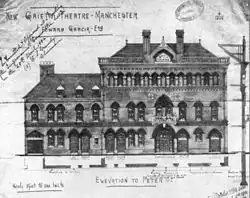 The new theatre was designed by Alfred Darbyshire for United Theatres Co. Ltd. and built on a plot of land near to the corner of Peter Street and Mount Street.[3] It opened as the Comedy Theatre in 1884. On 9 November 1908, it was bought by Annie Horniman for £25,000 and reconstructed to plans by Frank Matcham, reducing its capacity from 2,500 to 1,300.[1] The theatre reopened as the Gaiety Theatre in 1912.[3] It was Britain's first regional repertory theatre.[4] In 1920 the theatre was taken over by Samuel Fitton & Associates but closed in 1922. It was in use again between 1945 and 1947 but was demolished in 1959.[1]