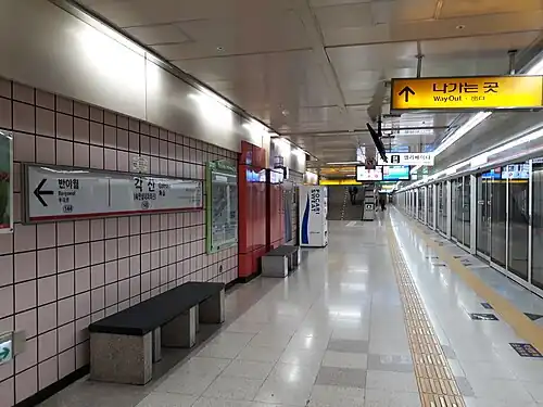 Gaksan Station (Korean: 각산역; Hanja: 角山驛; RR: Gaksan-yeok) is an commuter train station on the Daegu Subway Line 1 in Sinseo-dong, Dong District, Daegu, South Korea. There are many apartments surrounding the station. You can enter the Dongho residential area in order to get to Gumgang-dong.[1]