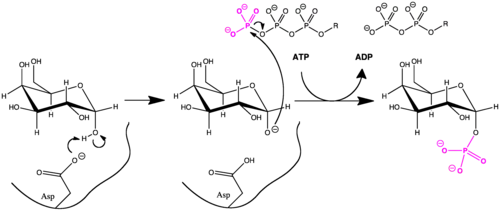 Recently, the roles of active site residues in human galactokinase have become understood. Asp-186 abstracts a proton from C1-OH of α-D-galactose, and the resulting alkoxide nucleophile attacks the γ-phosphorus of ATP. A phosphate group is transferred to the sugar, and Asp-186 may be deprotonated by water. Nearby Arg-37 stabilizes Asp-186 in its anionic form and has also been proven to be essential to galactokinase function in point mutation experiments.[9] Both the aspartic acid and arginine active site residues are highly conserved among galactokinases.[8]