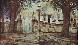 This spectral procession is said to be composed of the spirits of the dead, cloaked in robes, silently wandering the countryside at night. The eerie parade is led by a living person carrying a cross and a cauldron of holy water, who is cursed to walk until another unfortunate soul takes their place. The Santa Compaña is often seen as a harbinger of death or misfortune, visiting homes where someone is soon to die. Those who witness the procession are advised not to look directly at it or cross its path, lest they fall under its curse. To avoid being chosen as the procession's leader or to protect oneself from its effects, Galicians have traditionally used protective charms or prayers.[3] A cruceiro (calvary) is believed to offer protection against the Santa Compaña as well. These roadside crosses, commonly found at intersections or paths, are sacred markers where the living can seek refuge from supernatural entities.