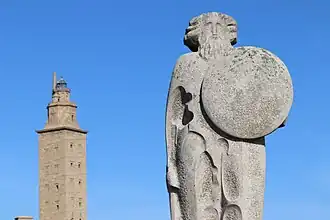 Galician mythology comprises a collection of related and unrelated myths forming part of the traditional culture of the Galician people. Legend identifies Breogán, a mythical Celtic king, as the founder of the Galician nation. The Tower of Hercules in A Coruña, a Roman lighthouse, is associated with a legend where the hero Hercules slew the giant Geryon and buried his head beneath the tower. Prominent mythological figures include the Mouros, often associated with ancient megalithic structures like dolmens and hillforts and depicted as guardians of hidden treasures or wielders of magical powers, and the Meigas (witches). The Santa Compaña, a procession of the dead, also features prominently. These mythological themes, rooted in oral tradition and influenced by ancient inhabitants of the region, influence Galician culture, appearing in folklore, literature, and music.