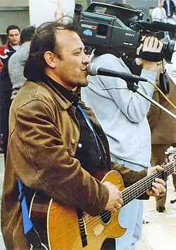 At the beginning of 1990 Galija, alongside Yugoslav rock acts Riblja Čorba, Valentino, Viktorija and Bajaga i Instruktori, performed in Timișoara, Romania, at the three-day concerts organized two months after the Romanian Revolution.[21] All five acts performed on three concerts in Timișoara Olympia Hall in front of some 20,000 people each night.[26] During the same year, the compilation album Još uvek sanjam (Najveći hitovi) (I'm Still Dreaming (Greatest Hits)) was released, with some of the old songs re-recorded.[21] At the time of the first multi-party elections in Yugoslavia, Galija, after the idea of Kanjevac and journalist Petar "Peca" Popović,[27] recorded an EP with songs "On je isti kao on" ("He Is just like Him"), "Ti si moja jedina partija" ("You Are My Only Party"), "Posle svega" ("After Everything") and "Komunista" ("Communist", which featured Romani musician Šaban Bajramović on vocals).[21] The EP featured provocative lyrics dealing with the uncertain future of the country ("On je isti kao on" compared Josip Broz Tito and Slobodan Milošević) and was, because of the political censorship, never released.[21][27]