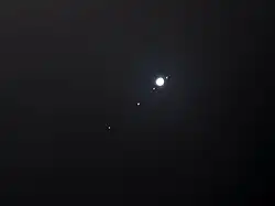 The Galilean moons (/ˌɡælɪˈleɪ.ən/),[1] or Galilean satellites, are the four largest moons of Jupiter. They are, in descending-size order, Ganymede, Callisto, Io, and Europa. They are the most readily visible Solar System objects after Saturn, the dimmest of the classical planets; though their closeness to bright Jupiter makes naked-eye observation very difficult, they are readily seen with common binoculars, even under night sky conditions of high light pollution. The invention of the telescope allowed astronomers to discover the moons in 1610. Through this, they became the first Solar System objects discovered since humans have started tracking the classical planets, and the first objects to be found to orbit any planet beyond Earth.