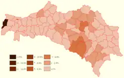 According to the Austrian census from 1900 there were 212,327 (or 2.7%) German-speaking people in Galicia.[5] Of this number around 80,000 constituted German Christians.[6] The rest came from part of the Galician Jews (the census did not give the opportunity to declare Yiddish language),[7] of whom roughly 20,000 considered themselves German.[6] As a German-speaking was also qualified the population of Wilamowice, traditionally speaking Wymysorys language.