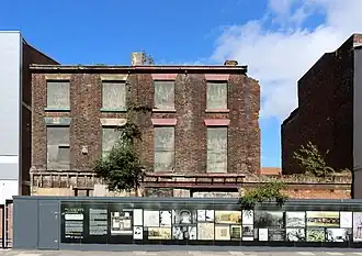 29 Pembroke Place was one of a terrace of Georgian town houses built in 1820. In 1907 it was purchased by Percy Galkoff, a Jewish emigré from Poland, who had it reconstructed as a kosher butcher's shop. In 1933 he added the tiled shop front which is a feature of the building The business was run by him and his family until 1979, when it was sold to Liverpool City Council. The building changed hands several times, becoming derelict despite remedial work, and afflicted throughout by planning blight.[3] The current owners, Liverpool School of Tropical Medicine, have co-operated with the Museum of Liverpool Life to preserve the frontage of No.29 and the neighbouring Grade II listed court dwellings, in their “Secret Life of Liverpool” project.[4][5] The frontage is now on display at the museum.