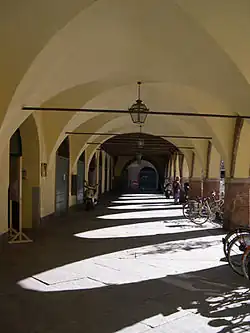 By looking at old maps, one can easily detect the existence of two ancient suspended pathways connecting the palace to two neighbouring buildings, home to the podestà and the governor; these were destroyed in 1850, when Palazzo Gallavresi was owned by the Bellinzaghis.