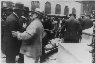 Galleanists were primary suspects in a campaign of bombings between 1914 and 1920. Instances included mail bombs to business and government officials and the 1920 Wall Street bombing, which killed 38 people.[1] In effect, however, none of the Galleanisti bombs hit their targets: capitalists, police, or judges. Their casualties were themselves and bystanders.[6] Their bombing methods borrowed from the Italian Black Hand extortion rackets, in which the attacker would write a threat of future violence and place bombs in doorways. These extortionists adapted fireworks, a popular Italian industry, with shrapnel or stolen dynamite from construction jobs. Anarchists, however, lacked the community experience with high explosives and thus overestimated their ability to create working bombs and underestimated their own risk.[6]