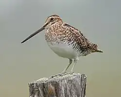 Wilson's snipe (Gallinago delicata) is a small, stocky shorebird.[2] The generic name Gallinago is Neo-Latin for a woodcock or snipe from Latin gallina, "hen" and the suffix -ago, "resembling". The specific name delicata is Latin for "dainty".[3]