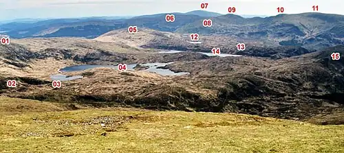 The location of Galloway has been described as follows, "Galloway is contained by sea to the west (North Channel) and south (Solway Firth), the "Galloway Hills" to the north, and the River Nith to the east".[1] So if we were to say "The hills of Galloway" we would be including all the hills within this area; but as the first sentence implies, the "Galloway Hills"[2] is usually taken to mean a collection of ranges which lie mainly south of Loch Doon and which are not constrained by political boundaries. The boundary between Dumfries and Galloway Region and Ayrshire runs west to east over Kirriereoch hill, drops south of Mullwharchar to the shores of Loch Enoch, before heading northwards up the east shore of Loch Doon, and so runs more or less through what might well be considered the heart of the Galloway hills – around Loch Enoch.
