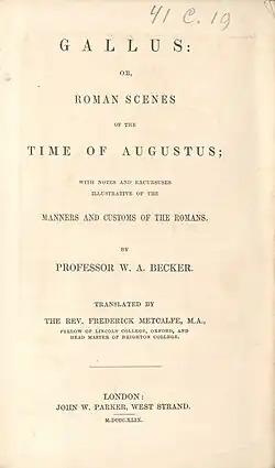Gallus, oder, Römische Scenen aus der Zeit Augusts: zur genaueren Kenntniss des römischen Privatlebens is a German book written by Wilhelm Adolf Becker, published in 1938.[1] The book was translated into English and renamed Gallus; or, Roman scenes of the time of Augustus: with notes and excursuses illustrative of the manners and customs of the Romans by Frederick Metcalfe in 1849. It is about the life of Cornelius Gallus and describes Roman domestic life.[1]