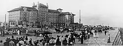 Preceding the Hotel Galvez overlooking the beach was the Beach Hotel, designed by Nicholas J. Clayton and completed in 1883. It was located on Tremont Street. The Beach Hotel was similar in style to some of the grand hotels built in the 1870s, the San Francisco Palace, the United States Hotel, and the Grand Union Hotel. Clayton equipped the Beach hotel with a mansard tower, a feature that he has also installed on the St. Mary's Infirmary in 1874. The three stories and three pavilions of the Beach Hotel rested on a base of 300 piles, arranged in three octagonal structures surrounding a rectangle, decorated in a polychrome-stick style.[3]