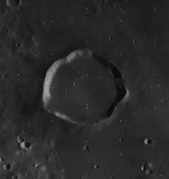 Gambart is a small lunar impact crater on the Mare Insularum, near the central region of the Moon. It is named after French astronomer Jean-Félix Adolphe Gambart.[1] It can be located to the south-southeast of the prominent ray crater Copernicus. In the past, the floor of Gambart has been flooded with lava, leaving a relatively flat surface surrounded by a smooth but somewhat polygon-shaped outer rim. To the southwest of Gambart is an area of hilly terrain deposited from ejecta during the Mare Imbrium impact, known as the Fra Mauro Formation.
