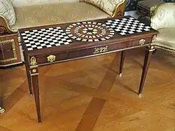 A games table desk is an antique desk form which has a writing surface etched or veneered in the pattern of a given board game. It also provides sufficient storage space for writing implements and a separate space for storing game accessories such as counters. It is often called a "games table" or game table, which leads to confusion with pieces of furniture (antique or modern) which are built specifically for gaming only, with no intention or provision for use as a desk.