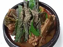 Gamja-tang[1] (Korean: 감자탕; pronounced [kam.dʑa.tʰaŋ]) or pork back-bone stew[1] is a spicy Korean soup made from the spine or neck bones of a pig. It often contains potatoes, cellophane noodles, greens, perilla leaves, green onions, hot peppers and ground perilla seeds.[2]