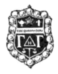 The fraternity's badge is a shield with a lamp, a star, and a Roman fasces or bundle, above the motto.[2] A triangle encloses the letter Π with Γ on both sides and below a balance.[2] The official badge contains 20 pearls surrounding the shield. The outgoing president or high chancellor is awarded a badge with a diamond border.