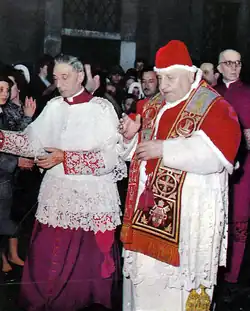 Bonaventura Gammarelli correctly guessed that Angelo Roncalli would be chosen as a compromise candidate in the 1958 papal conclave, and tailored the largest of the cassocks accordingly.[35][11][66] The firm had sewn for Roncalli since his time as a chaplain in the Italian army during World War I.[11] In the rush to dress him following his election, the correctly-sized garment was overlooked by the papal attendants and he was presented in the medium cassock with a slit in the back held together by safety pins.[65][67] Upon leaving the balcony, the correctly-sized cassock was waiting.[11][35][62] However, John XXIII gave the Gammarelli family far less business than his predecessor, ordering ten new cassocks over the course of his five-year reign as opposed to predecessors who ordered up to eight cassocks a year.[68] He did, however, utilize the clothier's services in reviving the camauro. Since there were no contemporary images to base their reproduction of the hat upon—it had not been used by popes since the late 18th century—Gammarelli looked to Rennaisance papal portraiture for inspiration.[69][70]