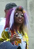 Yamanba (ヤマンバ), also sometimes shortened to just manba (マンバ),[8][2] is a more extreme style that evolved from ganguro. Old school yamanba featured deep tans and white lipstick, pastel eye makeup, tiny metallic or glittery adhesives below the eyes, brightly colored circle lenses, vibrant clothing, and incongruous accessories, such as Hawaiian leis. While yamanba faded in popularity it also started to become more extreme, with multicolored and usually synthetic hair. Manba in 2008 saw a darker tan, and no facial stickers. Hair was usually neon/bright colors, with pink being a favorite. Wool-emulating dreadlocks, extensions, and clips were worn to make the hair appear longer. Clothing remained the same, although leis were worn less frequently.[2]