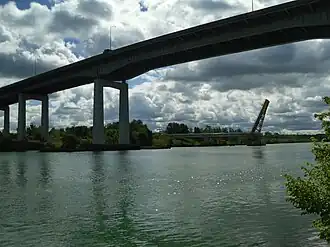 The Garden City Skyway is a major high-level bridge located in St. Catharines and Niagara-on-the-Lake, Ontario, Canada, that allows the Queen Elizabeth Way (QEW) to cross the Welland Canal without the interruption of a lift bridge. Six lanes of traffic are carried across the bridge, which is 2.2 kilometres (1.4 mi)[2] in length and 40 metres (130 ft) at its tallest point.