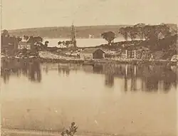 Garden Island was originally an island in Sydney Harbour, but extension of the base and the construction of a dry dock in the channel between the island and the mainland have resulted in its connection to the mainland shore at Potts Point from the 1940s. The wharves of the naval base now stretch the length of the eastern side of Woolloomooloo Bay, from the suburb of Woolloomooloo to the end of the original island.[1]