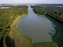 In the history of gardening and landscaping, a canal is a relatively large piece of water that has a very regular shape, usually long, thin and rectangular.[2] The peak period for garden canals was the 17th and 18th centuries, by the end of which less formal water features were in favour, in the style of the English landscape garden. It is distinguished from a garden pond or lake by its shape, and typically falls somewhere between the two in area. It might be wholly artificial, created by diverting and damming a stream, or based around a natural water feature which is landscaped. Usually it appears to be enclosed, though in fact water passes in and out by channels below the surface. The edges are often walled, and the water relatively shallow.[3]