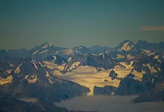 The Garden of Eden Ice Plateau is a large ice field on the western side of New Zealand's Southern Alps / Kā Tiritiri o te Moana. At over 9 km (5.6 mi) long, the Garden of Eden is one of the largest ice fields in New Zealand, along with the equally-sized Garden of Allah Ice Field which sits just to the north.[2] The ice field is one of many geographic features in the area between the main divide of the Southern Alps and the Adams Range which share biblical names, a convention first established by the earliest explorers to the area.[3] The Garden's remote location and difficult conditions make research difficult, especially with restrictions on helicopter landings imposed through the designation of the area as Adams Wilderness Area in 2003.[1][2] Despite this, the ice plateau has been a popular destination for tramping groups for over 80 years, with access routes from both coasts and easily reachable areas once on the plateau itself.[4]
