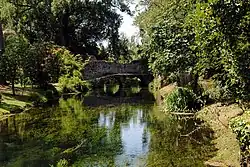 The garden includes the ruins of the ancient settlement of Ninfa, whose name seems to derive from a classical era nymphaeum, a temple dedicated to nymphs, located on an island in the small lake; nymphs were believed to dwell in mountains and groves, by springs and rivers, and also in trees and in valleys and cool grottoes.[3] According to Charles Quest-Ritson's book Ninfa: The Most Romantic Garden in the World, the Gardens of Ninfa's first documented evidence is from Pliny the Younger, who described a temple on the premises dedicated to water nymphs.[4]