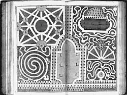 In the Western history of gardening, from the 16th to early 19th centuries, a wilderness was a highly artificial and formalized type of woodland, forming a section of a large garden.[1] Though examples varied greatly, a typical English style was a number of geometrically-arranged compartments (often called "quarters") closed round by hedges, each compartment planted inside with relatively small trees. Between the compartments there were wide walkways or "alleys", usually of grass, sometimes of gravel. The wilderness provided shade in hot weather, and relative privacy. Though often said by garden writers at the time to be intended for meditation and reading, the wilderness was much used for walking, and often flirtation. There were few if any flowers, but there might be statues, and some seating, especially in garden rooms or salle vertes ("green rooms"), clearings left empty. Some had other features, such as a garden maze.[1]