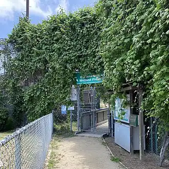 The upland area which surrounds the wetland includes the Perimeter Trail, about 3⁄4 mile (1.2 km) long, from which the public can view the upland, wetlands and wildlife. From the Trail, the public can access the Overlook Deck and ZigZag Bridge, both of which afford closer views, without disturbing wildlife. This basic infrastructure was built around 2001.[1]