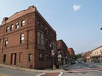 The Gardner News Building anchors the northern end of Gardner's downtown commercial district, occupying a corner lot facing south at Vernon and Central Streets. It is a three-story brick structure, roughly trapezoidal in shape due to its lot configuration, and is adorned with sandstone and brick trim. Its main facade faces roughly south toward Central Street, and is roughly divided into three sections. The outer sections have two bays of windows on the third floor, and projecting bay windows on the second floor. The right section has the main building entrance, while that on the left has a three-part window with stone lintel. The center section of the building has three window bays on each level. There are courses of corbelled brickwork above and below the third floor, and the building is crowned by a brick parapet.[3]