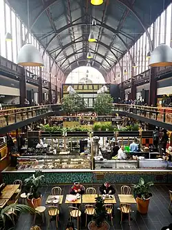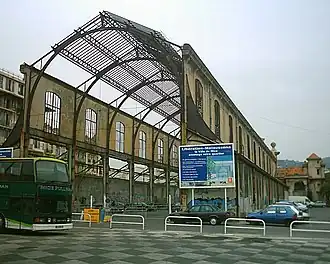 The first phase of the project, the internal and external renovation of the station building, took place in 2013. Work was completed by December of that year and the building was re-opened on 4 January 2014. The new Raoul Mille library has been incorporated into the station's former waiting room and the building now houses multimedia rooms, meeting rooms and a climate-controlled storage basement.[3] The second phase of the project involved the restoration of the train shed site. Plans were drawn up for a shopping centre, cinema, sports facilities, housing and underground car park,[7] and the return of Gustave Eiffel's listed train shed.[8] The plans were initially opposed by councillor Jean Claude Mari. However, he dropped legal proceedings in November 2014, allowing the city of Nice and the developers to begin work. The underground car park had been completed by the middle of 2016 and it was anticipated at that time that the renovation of the former train shed would be completed by 2017 with other facilities expected to open during the second quarter of 2018. The project won the Pyramide d'or, the highest award of the Fédération des Promoters Immobilisers in 2016.[9][10] In March 2018, during ongoing redevelopment work, the main hall was temporarily opened to the public to house an exhibition by the Salon du Vintage.[11] On 10 May 2019 it was confirmed that the hall's inauguration was scheduled for 17 May 2019 with its public opening on the next day.[12] The restored train shed houses a food court with businesses selling food from the local region. A mezzanine at each end is linked to the ground floor by a wide staircase. Plans remain for the addition of a nightclub, fitness center, cultural center and offices.[4]