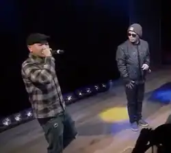 On June 24, 2010, it was officially announced that Garion will come back with their second album called Garion2 (가리온2) in August.[7] Nevertheless, because of Naachal's health problem and MC Meta's personal problems, they announced that they are expecting to release their album in September and that DJ Skip became their new assistant DJ.[8] The album was released in October.[9] After the release, it was applauded by the masses and the two members actively held concerts. Before long, Naachal became a rap teacher in FnC academy and is teaching students until now.[10] In 2011, Garion2 (가리온2) received 'The Best Album of the Year', 'The Best Hip-hop Album of the Year', and 'The Best Hip-hop song of the Year' in the Korean Music Awards.[11] In 2012, MC Meta and Naachal became the founders of the crew 'Bulhanddang' (불한당, 不汗党).[12]