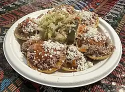 ![]() Garnachas topped with tomato sauce, fresh cheese and curtido. | |